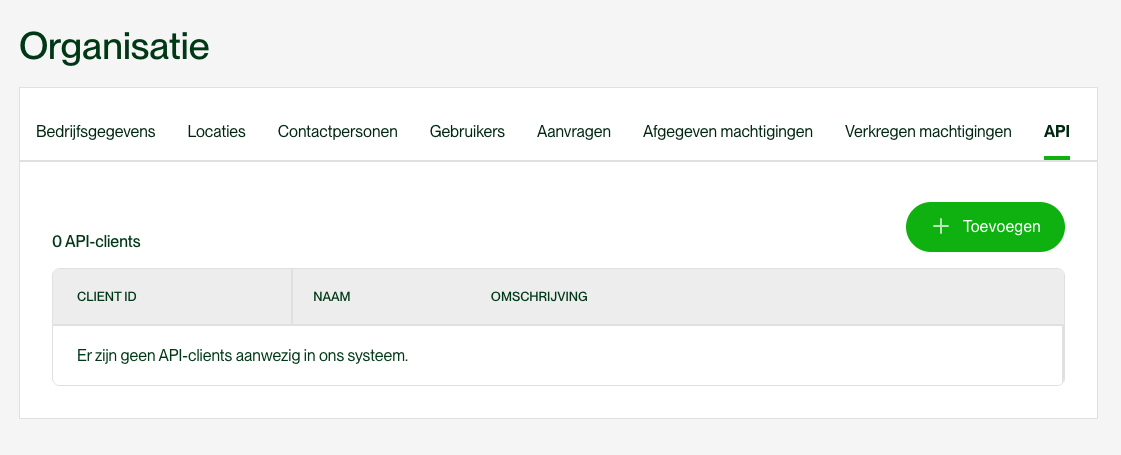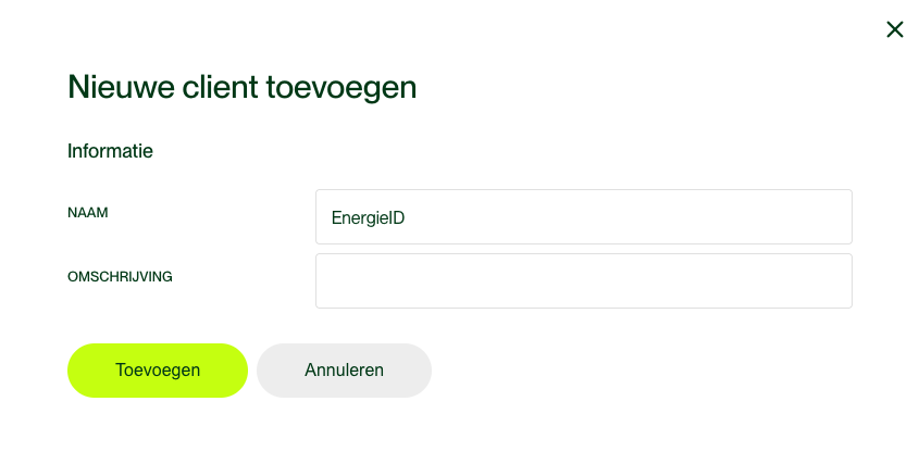 - Entrez le nom de votre client API et cliquez sur Ajouter. Nous recommandons le nom EnergieID pour indiquer clairement que ce client API est destiné à la connexion avec EnergieID.