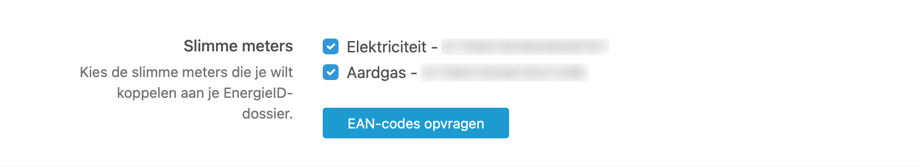 Klik op ‘EAN-codes opvragen’. EnergieID haalt dan alle slimme meters op die op het ingevoerde adres bekend zijn. Deze worden overzichtelijk weergegeven.