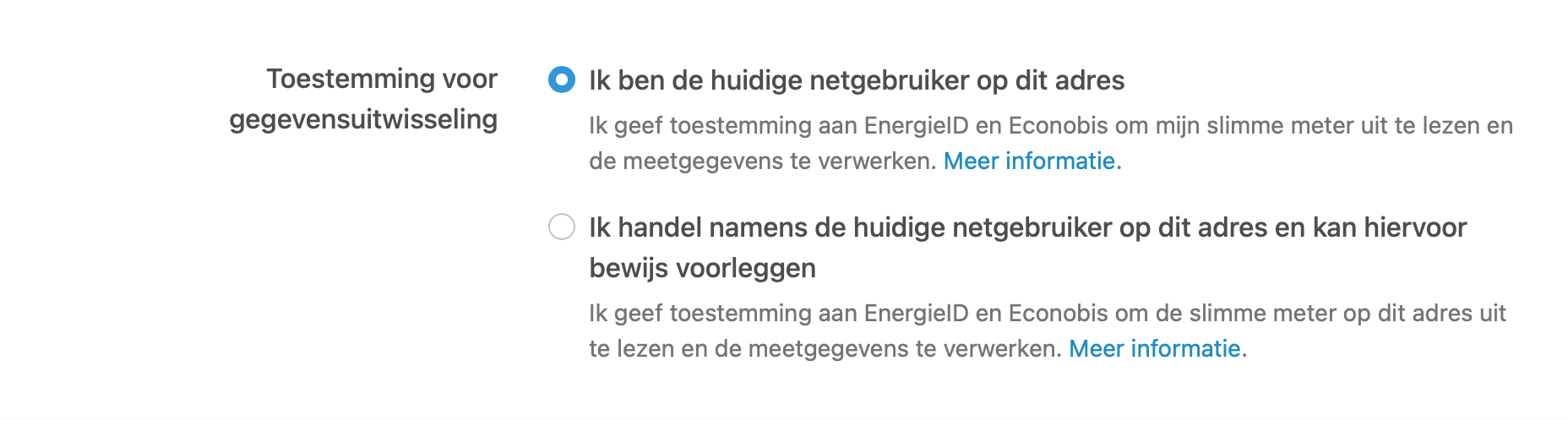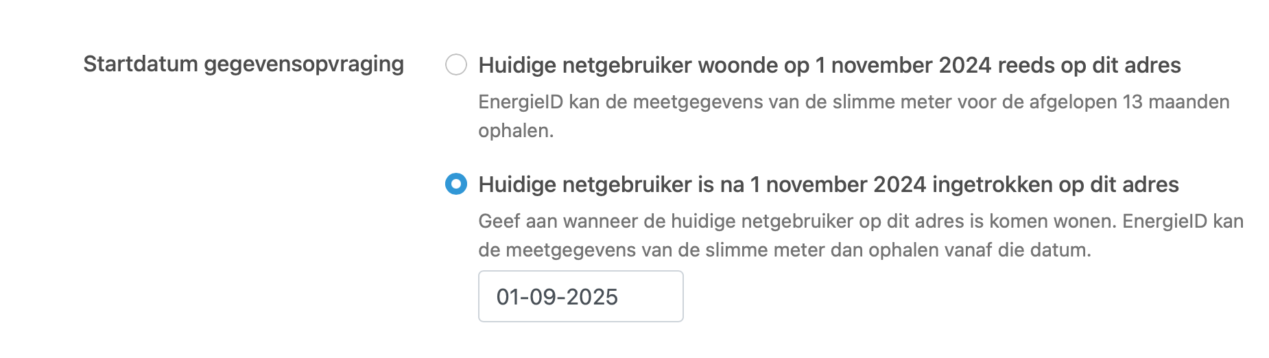 Indien de huidige netgebruiker minder dan 13 maanden geleden op het adres is komen wonen, moet je aangeven vanaf welke datum het energiecontract van de huidige netgebruiker gestart is. We gebruiken die datum als startpunt voor het opvragen van de meetgegevens.