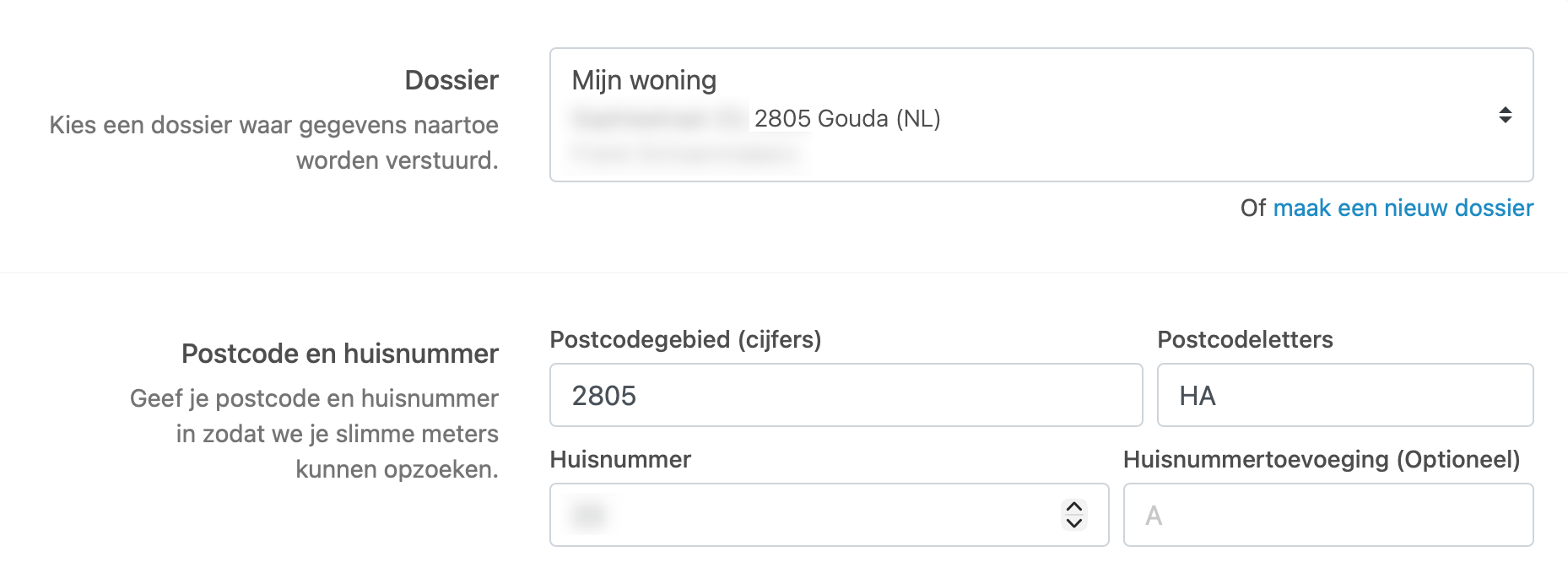 Let op: Het ingevoerde adres moet volledig overeenkomen met het adres waarop de slimme meters geregistreerd staan.- Als je géén huisnummertoevoeging invult, worden enkel de meters zonder toevoeging getoond.